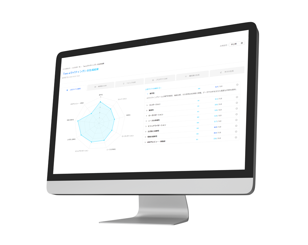 解像度の高い分析データ、構成案、そしてSEO記事が自動生成されます。